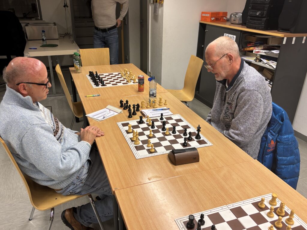 Auf dem Spitzenbrett kam es zu einem von Taktik geprägtem Schlagabtausch, wo lange Zeit keiner der beiden einen Vorteil erzielen konnte. Es kam zu einem Endspiel in dem Reinhard zwei Türme gegen einen Turm, Springer und Läufer von Nils auf dem Brett hatte. Einige Bauern waren ebenfalls noch auf dem Brett, und die Stellung war auf eine Punkteteilung einzuschätzen. Aber Nils musste gegen zwei verbundene Bauern spielen, und hatte zusätzlich das Problem dass die gegnerischen Türme sehr aktiv standen. Letztlich war die Stellung nicht mehr zu halten, und Nils musste eine seiner wenigen Niederlagen hinnehmen.