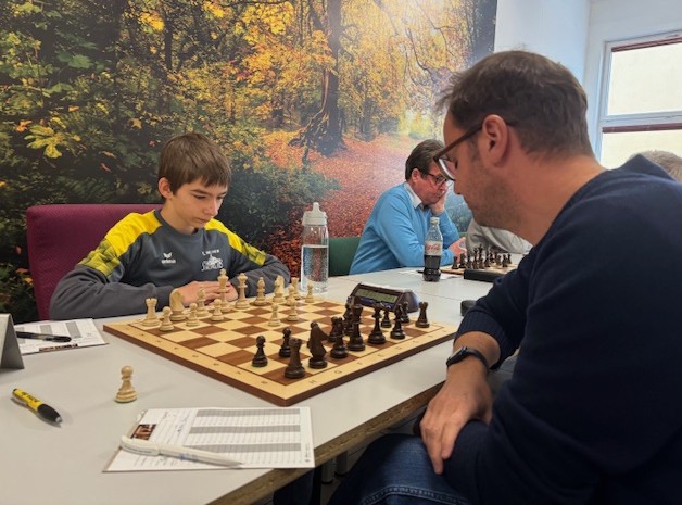 Das war die kürzeste Partie des Tages, denn die beiden spielten den „ Londoner „ genau nach Theorie, nur mit dem Unterschied, dass Mathias diese etwas besser kennt. Nach einem Bauergewinn stand er schon klar besser, und Elias unterlief dann noch ein Fehler. Nach einem Turmtausch, übersah er eine Springergabe, mit Figurenverlust. Er gab dann die Partie sofort auf.